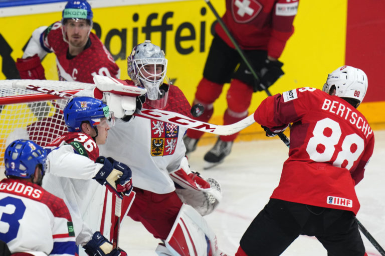 Brankár Česka Lukáš Dostál a dobiedzajúci Christoph Bertschy zo Švajčiarska (vpravo) počas zápasu základnej A-skupiny na MS v hokeji 2024. Praha (O2 Arena), 13. máj 2024. Foto: SITA/AP