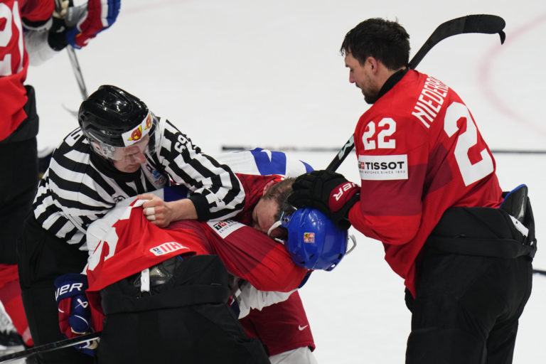 Rozhodca sa snaží ukončiť potýčku Romana Josiho (vľavo) Jana Ruttu z Česka počas zápasu základnej A-skupiny na MS v hokeji 2024. Praha (O2 Arena), 13. máj 2024. Foto: SITA/AP