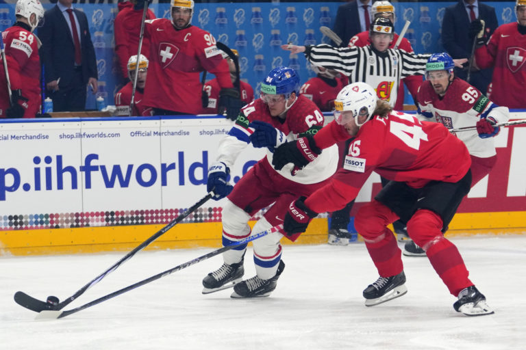 Dominik Kubalík z Česka (vľavo) v súboji s Dariom Simionom zo Švajčiarska počas zápasu základnej A-skupiny na MS v hokeji 2024. Praha (O2 Arena), 13. máj 2024. Foto: SITA/AP