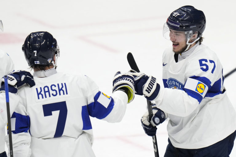 Arttu Hyry z Fínska (vpravo) a jeho spoluhráč Oliwer Kaski oslavujú gól v bránke Nórska počas zápasu základnej A-skupiny na MS v hokeji 2024. Praha (O2 Arena), 13. máj 2024. Foto: SITA/AP