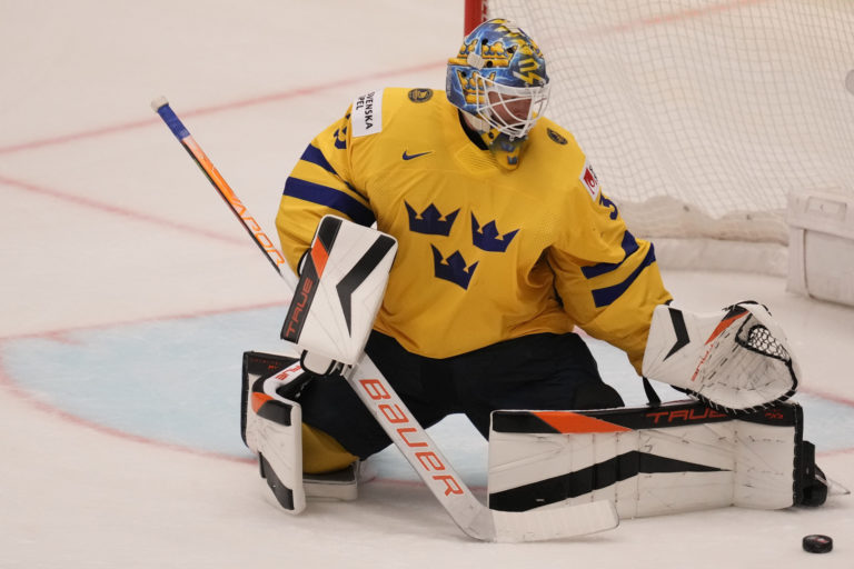 Brankár Švédska Samuel Ersson v akcii počas zápasu základnej B-skupiny proti Nemecku na MS v hokeji 2024. Ostrava (Ostravar Aréna), 13. máj 2024. Foto: SITA/AP