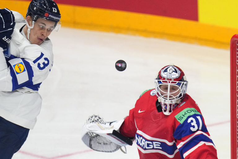 Brankára Nórska Jonasa Arntzena triafa puk počas zápasu základnej A-skupiny proti Fínsku na MS v hokeji 2024. Praha (O2 Arena), 13. máj 2024. Foto: SITA/AP