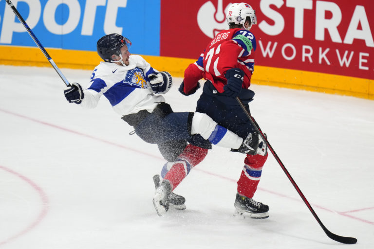 Juha Jaaska z Fínska (vľavo) padá po strete so Stianom Solbergom z Nórska počas zápasu základnej A-skupiny na MS v hokeji 2024. Praha (O2 Arena), 13. máj 2024. Foto: SITA/AP