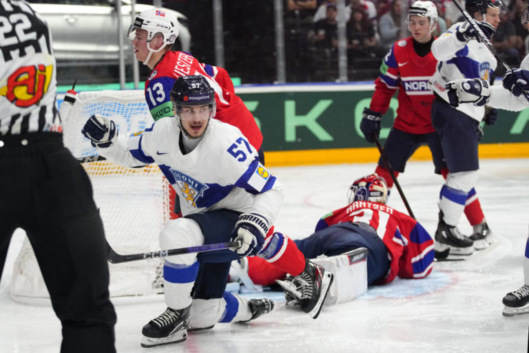 Arttu Hyry z Fínska sa raduje zo svojho gólu v bránke Nórska počas zápasu základnej A-skupiny na MS v hokeji 2024. Praha (O2 Arena), 13. máj 2024. Foto: SITA/AP