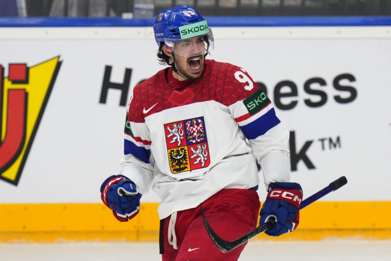 Matěj Stránsky z Česka sa raduje zo svojho gólu v bránke Švajčiarska počas zápasu základnej A-skupiny na MS v hokeji 2024. Praha (O2 Arena), 13. máj 2024. Foto: SITA/AP