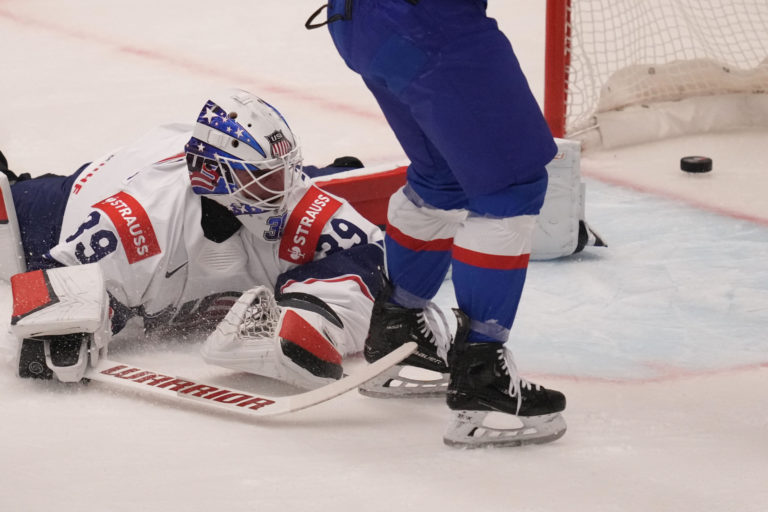 Zákrok slovenského brankára Samuela Hlavaja počas zápasu proti USA v základnej B-skupiny na MS v hokeji 2024. Ostrava (Ostravar Aréna), 13. máj 2024. Foto: SITA/AP.