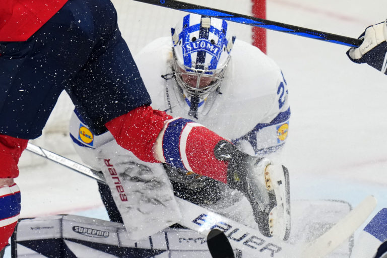 Brankár Fínska Harri Sateri v akcii počas zápasu základnej A-skupiny proti Nórsku na MS v hokeji 2024. Praha (O2 Arena), 13. máj 2024. Foto: SITA/AP
