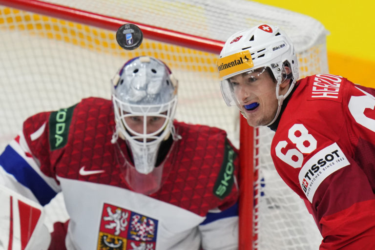 Fabrice Herzog zo Švajčiarska (vpravo) a brankár Česka Lukáš Dostál sledujú puk počas zápasu základnej A-skupiny na MS v hokeji 2024. Praha (O2 Arena), 13. máj 2024. Foto: SITA/AP