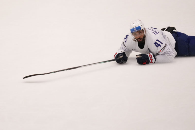 Francúzsky útočnék Pierre-Edouard Bellemare počas zápasu proti Poľsku v zápasu základnej B-skupiny na MS v hokeji 2024. Ostrava (Ostravar Aréna), 15. máj 2024. Foto: SITA/AP.