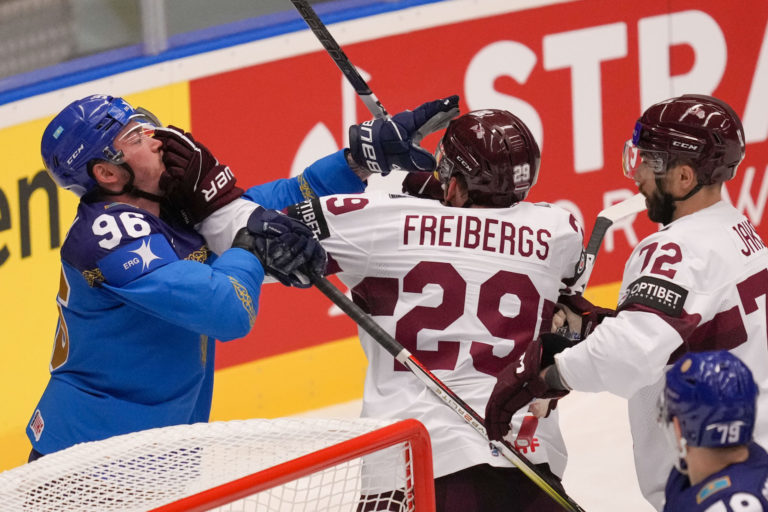 Šarvátka v zápase Kazachstan - Lotyšsko v zápase základnej B-skupiny na MS v hokeji 2024. Ostrava (Ostravar Aréna), 14. máj 2024. Foto: SITA/AP.