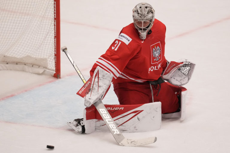 Zákrok poľského brankára Johna Murrayho počas zápasu proti Francúzsko v základnej B-skupine na MS v hokeji 2024. Ostrava (Ostravar Aréna), 15. máj 2024. Foto: SITA/AP.