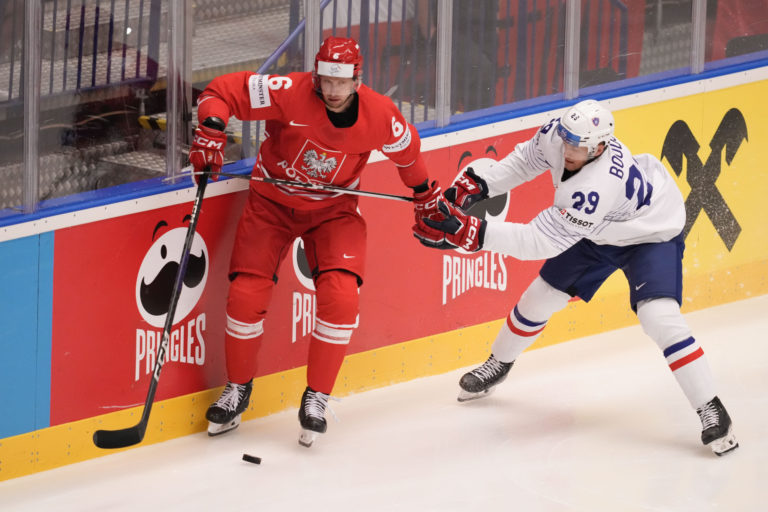 Poľský obranca Arkadiusz Kostek v súboji o puk s Francúzom Louisom Boudonom počas zápasu základnej B-skupiny na MS v hokeji 2024. Ostrava (Ostravar Aréna), 14. máj 2024. Foto: SITA/AP.