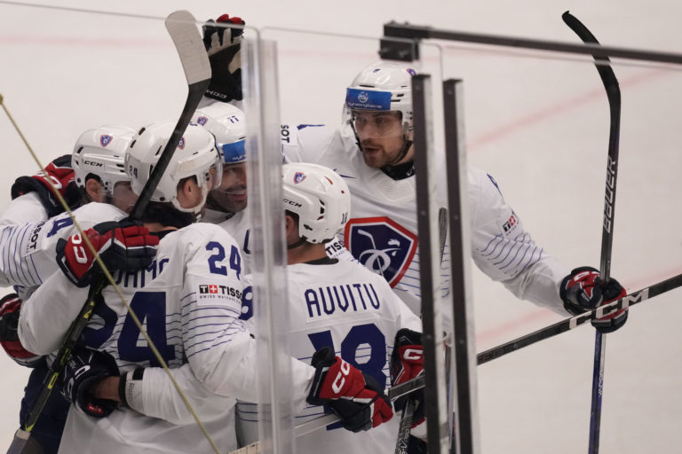 Francúszky útočník Justin Addamo sa so spoluhráčmi raduje zo svojho gólu v zápase proti Poľsku v základnej B-skupine na MS v hokeji 2024. Ostrava (Ostravar Aréna), 14. máj 2024. Foto: SITA/AP.