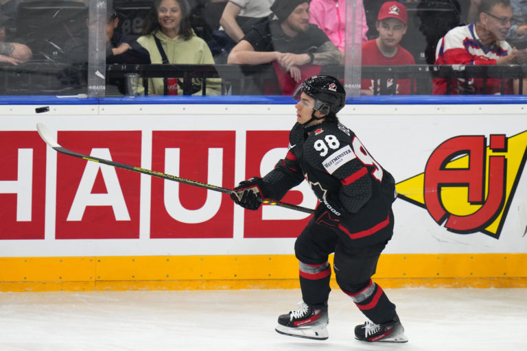Kanadský talent Connor Bedard počas zápasu proti Rakúsku v základnej A-skupine na MS v hokeji 2024. Praha (O2 Arena), 14. máj 2024. Foto: SITA/AP.