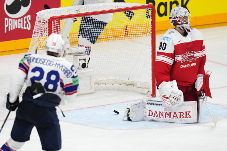 Nórsky útočník Michael Brandsegg-Nygård prekonáva dánskeho gólmana Frederika Dichowa počas zápasu A-skupiny na MS v hokeji 2024. Praha (O2 Arena), 14. máj 2024. Foto: SITA/AP.