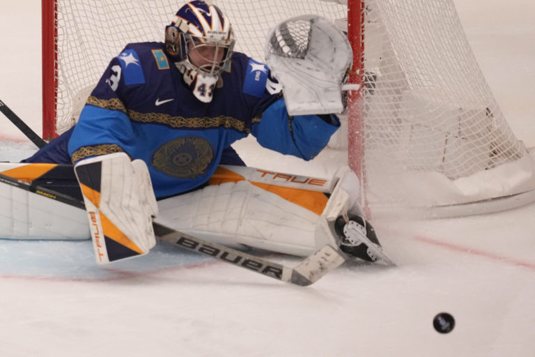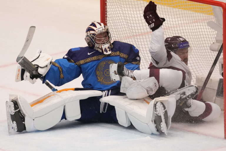 Zákrok kazašského brankára Andreja Šutova počas zápasu proti Lotyšsku v základnej B-skupine na MS v hokeji 2024. Ostrava (Ostravar Aréna), 14. máj 2024. Foto: SITA/AP.
