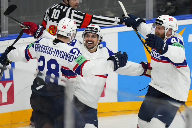 Nórsky útočník Michael Brandsegg-Nygård sa so spoluhráčmi teší zo svojho víťazného gólu v sieti Dánska počas zápasu A-skupiny na MS v hokeji 2024. Praha (O2 Arena), 14. máj 2024. Foto: SITA/AP.