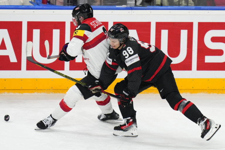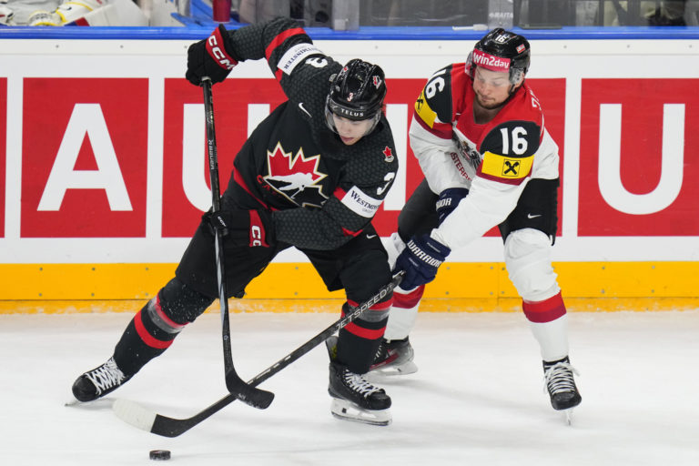 Kanadský talent Connor Bedard v súboji s Rakúšanom Petrom Schneiderom počas zápasu základnej A-skupiny na MS v hokeji 2024. Praha (O2 Arena), 14. máj 2024. Foto: SITA/AP.