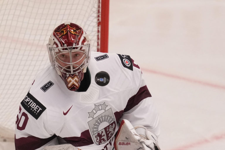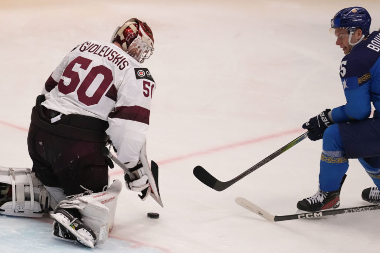 Zákrok lotyšského gólmana Kristersa Gudlevskisa počas zápasu proti Kazachstanu v základnej B-skupine na MS v hokeji 2024. Ostrava (Ostravar Aréna), 14. máj 2024. Foto: SITA/AP