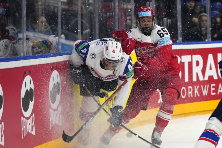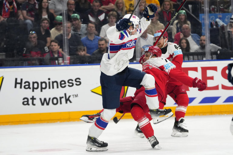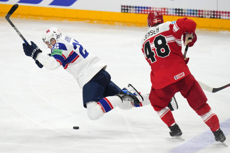 Nórsky útočník Martin Rønnild padá po faule Dána Nicholasa Jensena počas zápasu A-skupiny na MS v hokeji 2024. Praha (O2 Arena), 14. máj 2024. Foto: SITA/AP.