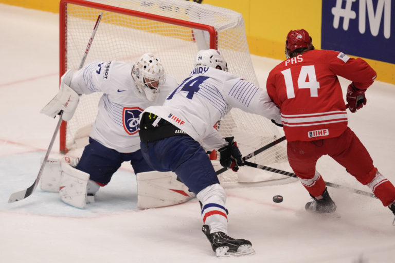 Gól francúzskeho útočníka Justina Addama počas zápasu proti Poľsku v základnej B-skupine na MS v hokeji 2024. Ostrava (Ostravar Aréna), 15. máj 2024. Foto: SITA/AP.