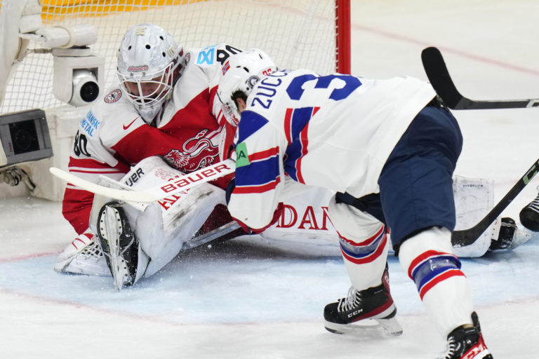 Nórsky útočník Mats Zuccarello sa snaží prekonať dánskeho gólmana Frederika Dichowa počas zápasu A-skupiny na MS v hokeji 2024. Praha (O2 Arena), 14. máj 2024. Foto: SITA/AP.