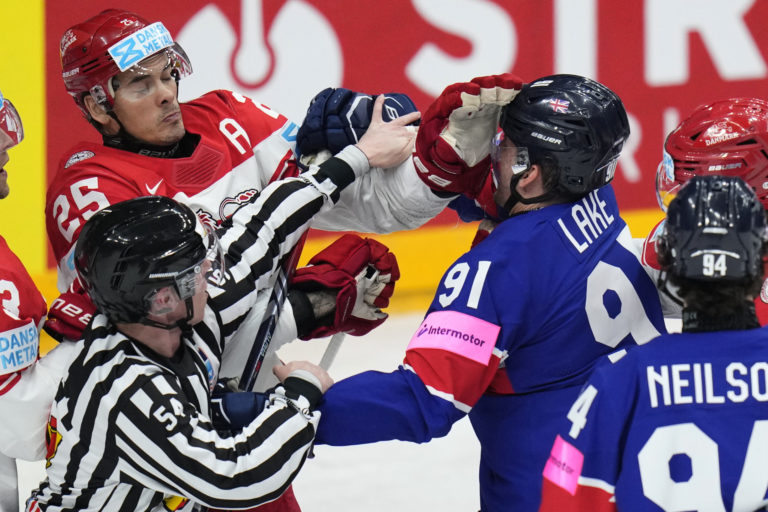 Oliver Lauridsen z Dánska (vľavo) v potýčke s Benom Lakeom z Veľkej Británie počas zápasu základnej A-skupiny na MS v hokeji 2024. Praha (O2 Arena), 17. máj 2024. Foto: SITA/AP