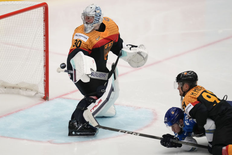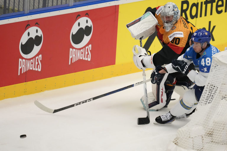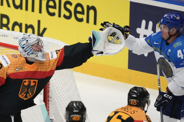Brankár Nemecka Philipp Grubauer (vľavo) sa snaží chytiť puk do lapačky pred Romanom Starčenkom z Kazachstanu počas zápasu základnej B-skupiny na MS v hokeji 2024. Ostrava (Ostravar Aréna), 17. máj 2024. Foto: SITA/AP