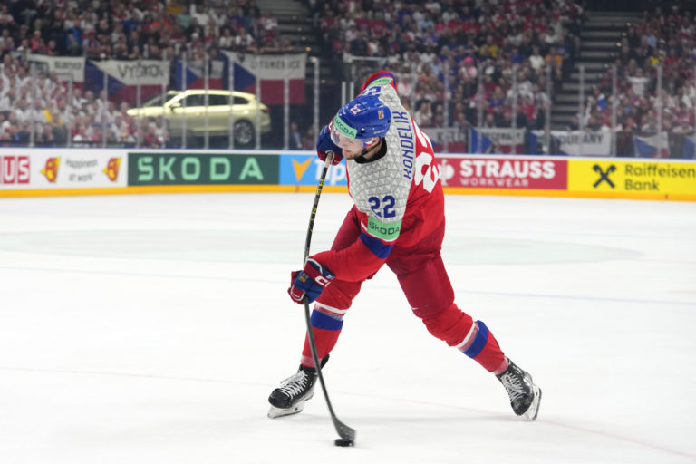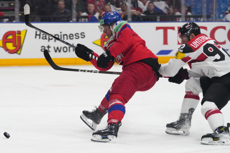 Jáchym Kondelík z Česka strieľa puk na bránku Rakúska počas zápasu základnej A-skupiny na MS v hokeji 2024. Praha (O2 Arena), 17. máj 2024. Foto: SITA/AP
