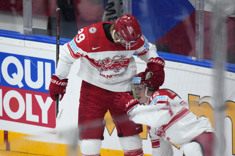 Mikkel Aagaard z Dánska (vľavo) sa raduje z gólu v bránke Veľkej Británie so svojím spoluhráčom Oscarom Molgaardom počas zápasu základnej A-skupiny na MS v hokeji 2024. Praha (O2 Arena), 17. máj 2024. Foto: SITA/AP