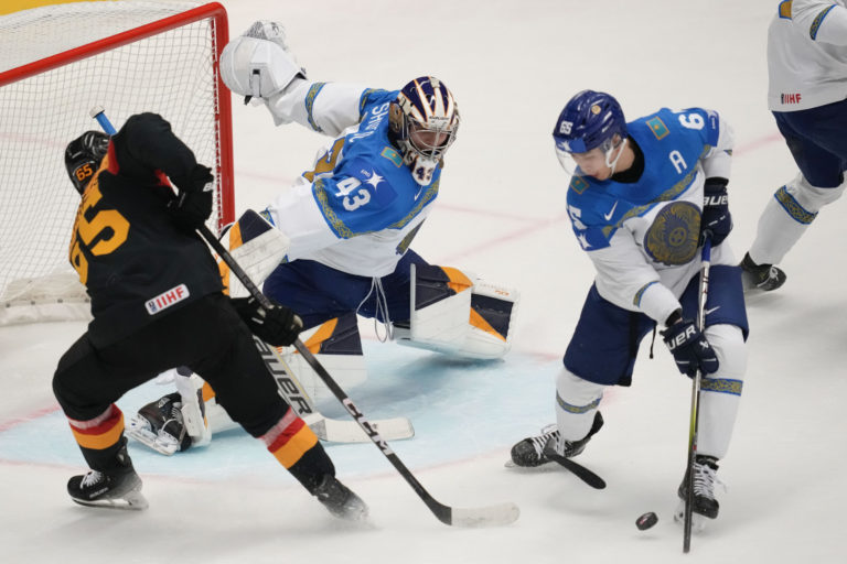 Brankár Kazachstanu Andrej Šutov (v strede) zasahuje pred Marcom Michaelisom z Nemecka (vľavo) počas zápasu základnej B-skupiny na MS v hokeji 2024. Ostrava (Ostravar Aréna), 17. máj 2024. Foto: SITA/AP
