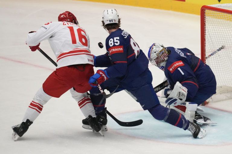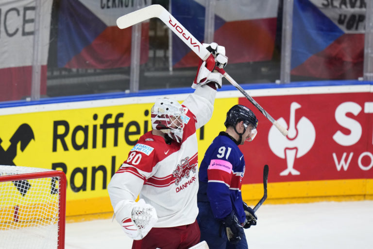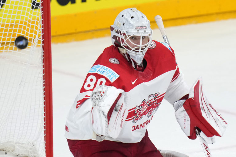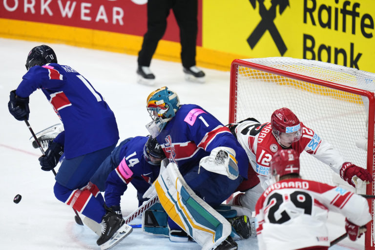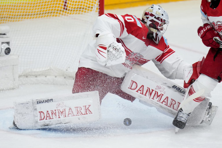 Brankár Dánska Frederik Dichow zasahuje počas zápasu základnej A-skupiny proti Veľkej Británii na MS v hokeji 2024. Praha (O2 Arena), 17. máj 2024. Foto: SITA/AP