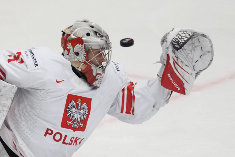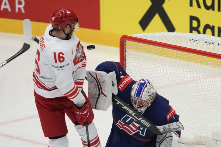 Brankár Poľska John Murray v akcii počas zápasu základnej B-skupiny proti USA na MS v hokeji 2024. Ostrava (Ostravar Aréna), 17. máj 2024. Foto: SITA/AP