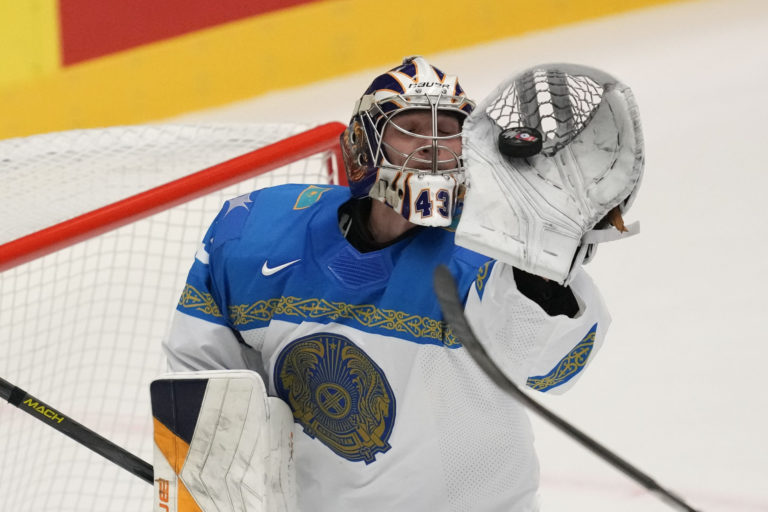 Brankár Kazachstanu Andrej Šutov chytá puk do lapačky počas zápasu základnej B-skupiny proti Nemecku na MS v hokeji 2024. Ostrava (Ostravar Aréna), 17. máj 2024. Foto: SITA/AP