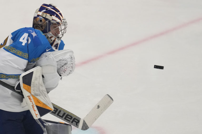 Brankár Kazachstanu Andrej Šutov sleduje letiaci puk počas zápasu základnej B-skupiny proti Nemecku na MS v hokeji 2024. Ostrava (Ostravar Aréna), 17. máj 2024. Foto: SITA/AP