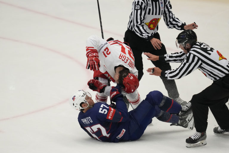 Kamil Walega z Poľska (hore) v potýčke so Shaneom Pintom z USA počas zápasu základnej B-skupiny na MS v hokeji 2024. Ostrava (Ostravar Aréna), 17. máj 2024. Foto: SITA/AP