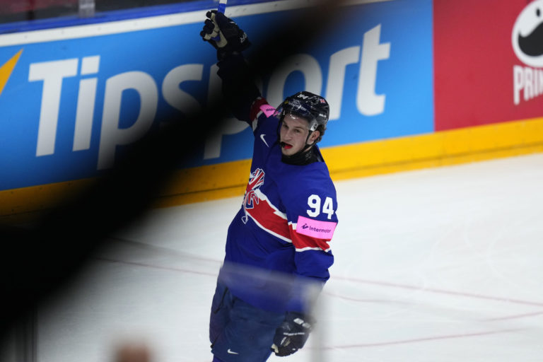 Cade Neilson z Veľkej Británie sa raduje zo svojho gólu v bránke Dánska počas zápasu základnej A-skupiny na MS v hokeji 2024. Praha (O2 Arena), 17. máj 2024. Foto: SITA/AP