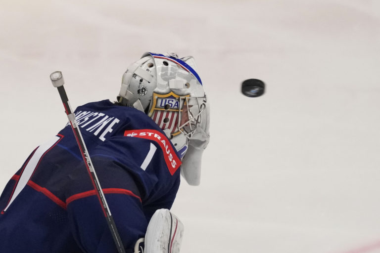 Brankár USA Trey Augustine počas zápasu základnej B-skupiny proti Poľsku na MS v hokeji 2024. Ostrava (Ostravar Aréna), 17. máj 2024. Foto: SITA/AP