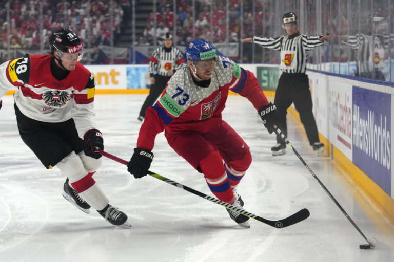 Ondřej Kaše z Česka (vpravo) sa snaží obísť Thima Nickla z Rakúska počas zápasu základnej A-skupiny na MS v hokeji 2024. Praha (O2 Arena), 17. máj 2024. Foto: SITA/AP