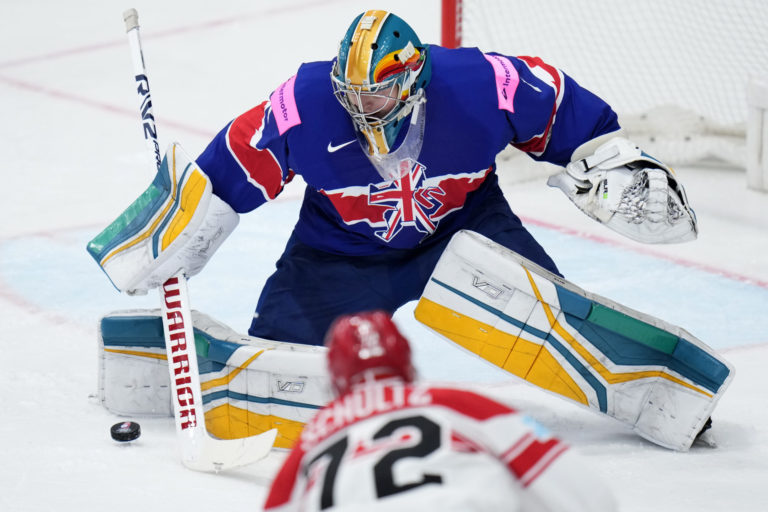 Brankár Veľkej Británie Jackson Whistle likviduje gólovú príležitosť Dánska počas zápasu základnej A-skupiny na MS v hokeji 2024. Praha (O2 Arena), 17. máj 2024. Foto: SITA/AP