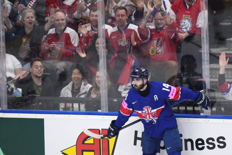 Liam Kirk z Veľkej Británie po strelení gólu do bránky Dánska počas zápasu základnej A-skupiny na MS v hokeji 2024. Praha (O2 Arena), 17. máj 2024. Foto: SITA/AP