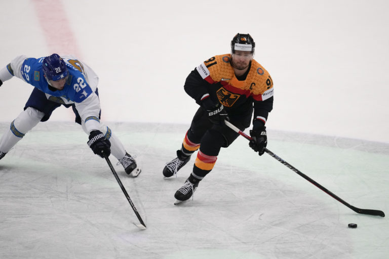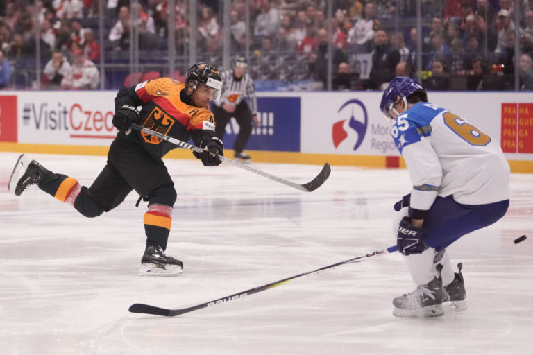 Yasin Ehliz z Nemecka (vľavo) strieľa puk popri Samatovi Danijarovi z Kazachstanu počas zápasu základnej B-skupiny na MS v hokeji 2024. Ostrava (Ostravar Aréna), 17. máj 2024. Foto: SITA/AP