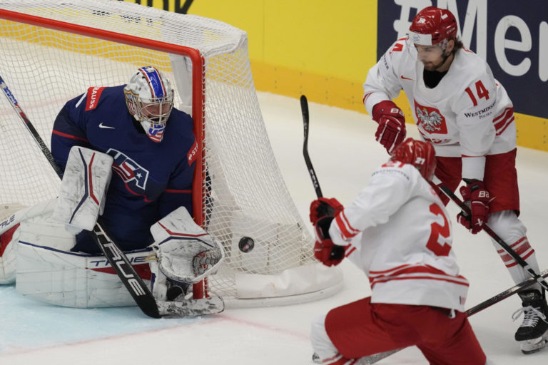 Brankár Poľska John Murray (vľavo) zasahuje pred Bradym Tkachukom z USA počas zápasu základnej B-skupiny na MS v hokeji 2024. Ostrava (Ostravar Aréna), 17. máj 2024. Foto: SITA/AP