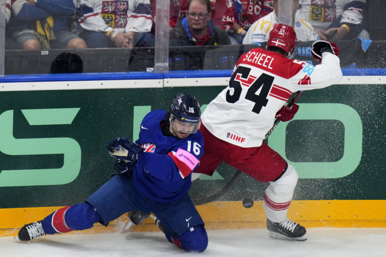 Sam Duggan z Veľkej Británie (vľavo) padá po súboji s Felixom Scheelom z Dánska počas zápasu základnej A-skupiny na MS v hokeji 2024. Praha (O2 Arena), 17. máj 2024. Foto: SITA/AP