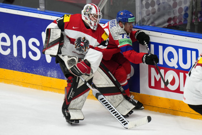 Daniel Voženílek z Česka (vpravo) sa snaží prekonať brankára Rakúska Davida Madlenera počas zápasu základnej A-skupiny na MS v hokeji 2024. Praha (O2 Arena), 17. máj 2024. Foto: SITA/AP