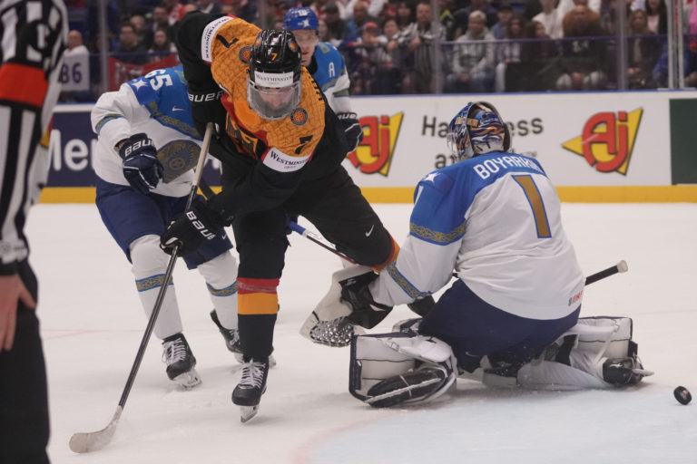 Maximilian Kastner z Nemecka (v strede) strieľa gól brankárovi Kazachstanu Nikitovi Bojarkinovi počas zápasu základnej B-skupiny na MS v hokeji 2024. Ostrava (Ostravar Aréna), 17. máj 2024. Foto: SITA/AP