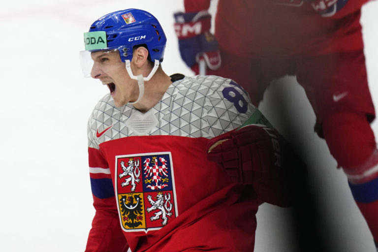 Dominik Kubalík z Česka sa raduje zo svojho gólu v bránke Rakúska počas zápasu základnej A-skupiny na MS v hokeji 2024. Praha (O2 Arena), 17. máj 2024. Foto: SITA/AP