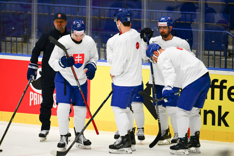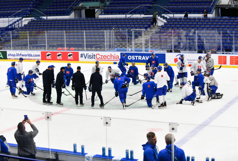 Hokejisti Slovenska počas predzápasového rozkorčuľovania pred zápasom Slovensko - Nemecko základnej B-skupiny majstrovstiev sveta v ľadovom hokeji 2024 v Českej republike. Ostrava, Česká republika, 10. máj 2024. Foto: SITA/Martin Medňanský.