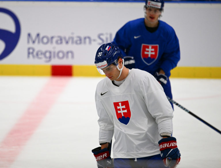 Juraj Slafkovský zo Slovenska (v popredí) počas predzápasového rozkorčuľovania pred zápasom Slovensko - Nemecko základnej B-skupiny majstrovstiev sveta v ľadovom hokeji 2024 v Českej republike. Ostrava, Česká republika, 10. máj 2024. Foto: archívne, SITA/Martin Medňanský.
