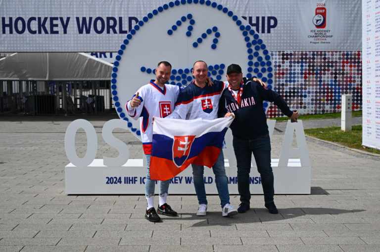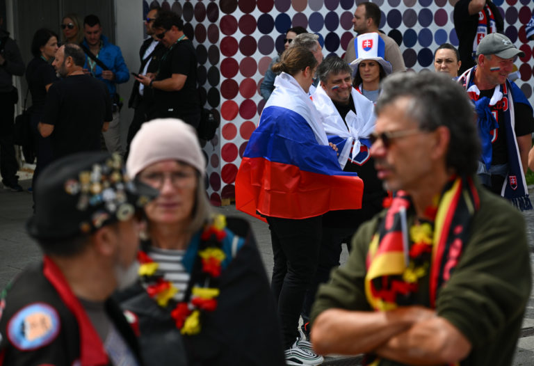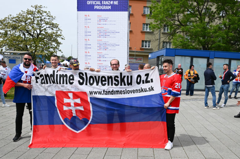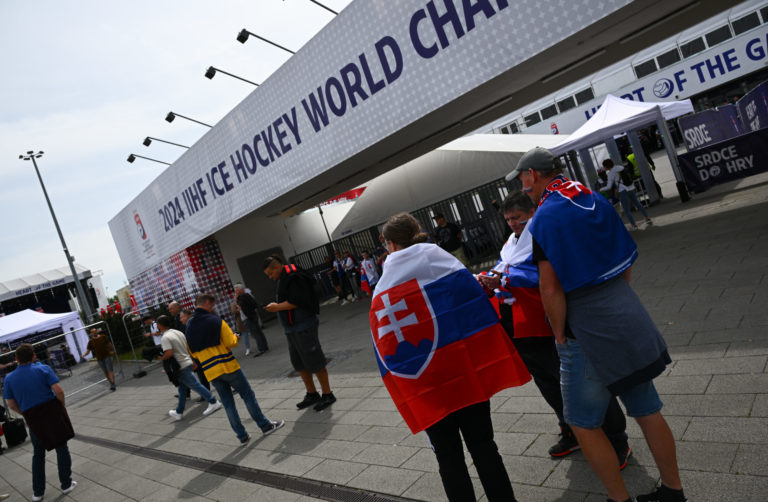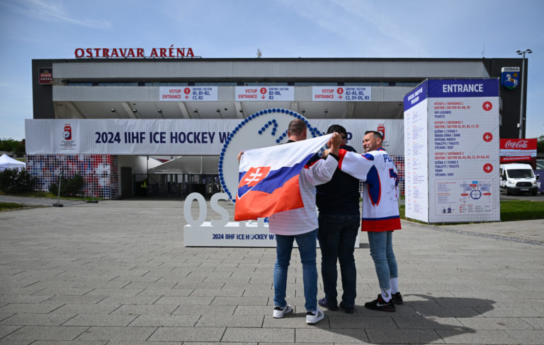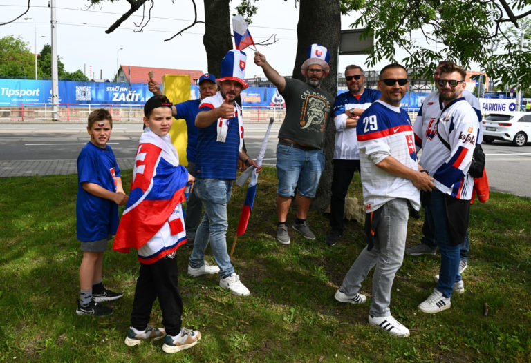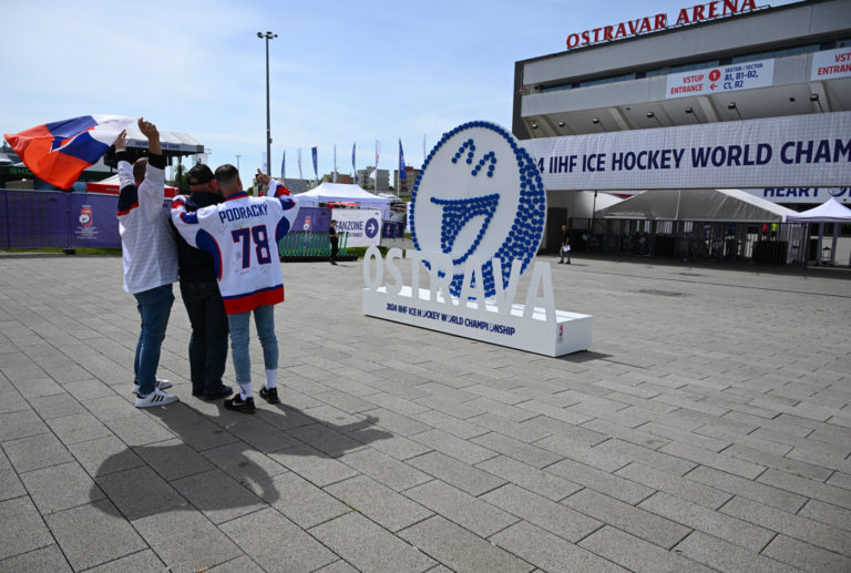 Fanúšikovia pred hokejovou Ostravar arénou pred zápasom Slovensko - Nemecko základnej B-skupiny majstrovstiev sveta v ľadovom hokeji 2024 v Českej republike. Ostrava, Česká republika, 10. máj 2024. Foto: SITA/Martin Medňanský.